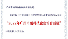 進德生物榮膺《2022 年廣州市“硬科技企業”培育百強》榜單
